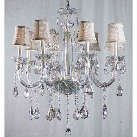 Люстра Денесса позволяет использовать до восьми ламп одновременно. Благодаря плафонам в мягком бежевом цвете свет, который исходит от люстры становится теплым и мягким. Отлично подходит для создания камерных и уютных интерьеров в классическом стиле. Люстра изготовлена в расцветке матовое серебро с голубоватым отливом. При желании подвесные стеклянные украшения можно снять.