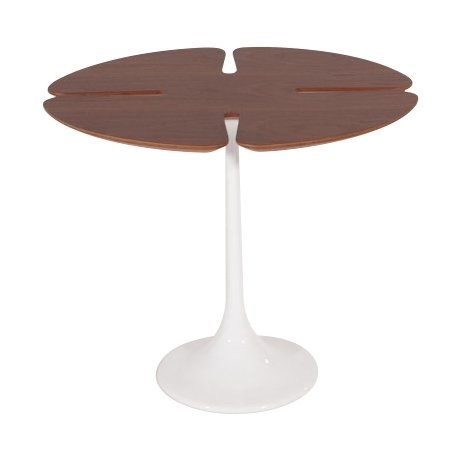 Дизайнерский кофейный стол Flower имеет овальную форму. Его столешница изготовлена из шпонированной фанеры, основой является натуральный орех. При этом вся конструкция держится на алюминиевой основе, окрашенной в белый цвет. Столь удачно сочетание цвета и формы, а также удачный размер позволяют использовать столик не только в частных, но и общественных помещениях, сэкономив пространство без потери концепции.