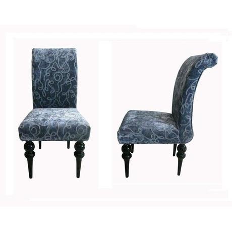 Мягкий стул с высокой спинкой. Обивка из серого бархата с гладким рисунком, точеные высокие ножки, покрытые черным глянцевым лаком. Изогнутая спинка стула обтянута так, что ткань образует дополнительный декор в виде шестиугольника на валике.