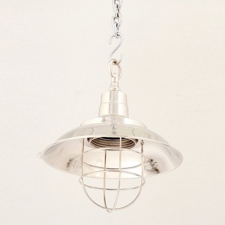 Подвесной светильник из светло серебристого отполированного металла напоминает форму уличного фонаря. Оригинальный аксессуар для интерьеров в стиле лофт. Винтажный каркас изготовили индонезийские мастера. Цоколь: Е-27, max 40W