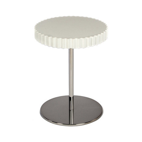 Журнальный столик стильного дизайна выглядит по-летнему нарядно: деревянная столешница с рельефными краями выполнена в отделке белым матовым лаком, а опора – из хромированного металла. Эта модель добавит оригинальности современному интерьеру загородного дома.