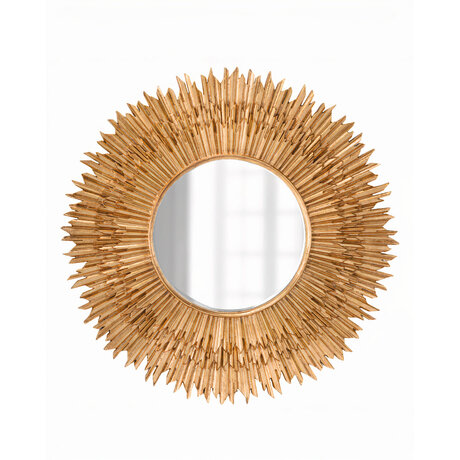 Настенное зеркало "Гренье" - это изысканное украшение для вашего дома, которое придаст интерьеру неповторимую атмосферу шика и элегантности. Это зеркало в форме солнца с рамой, выполненной из деревянных лучей, покрытых золотистой поталью, что придает ему роскошный и изысканный вид. Размер зеркала идеально подходит для подвешивания в спальне или в гостиной, создавая естественный фокус в помещении. Благодаря своему уникальному дизайну, зеркало "Гренье" станет не только функциональным элементом, но и стильным акцентом в вашем интерьере..