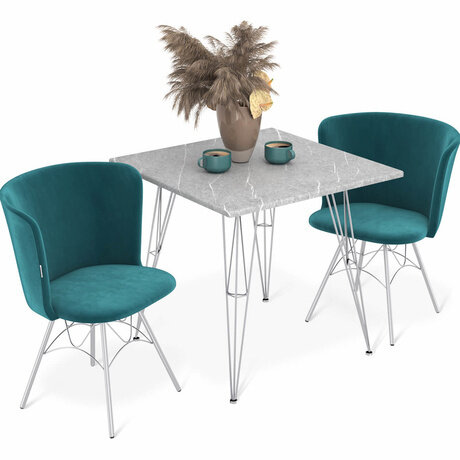 Ищете стильный обеденный комплект для небольшой кухни или студии? Набор SHT-DS322 с мраморной столешницей и бирюзовыми стульями занимает всего 80×80 см площади, но создает полноценную обеденную зону для двоих. Идеальное сочетание практичности и современного дизайна. Три главных преимущества: - Компактность — поместится даже в кухне от 6 кв.м - Практичная столешница — МДФ с имитацией мрамора не боится влаги и легко чистится - Эргономичные стулья — дугообразная спинка поддерживает позвоночник во время длительных посиделок Комплект идеально подойдет для молодых пар, одиноких людей или как дополнительная обеденная зона в большой квартире. Бирюзовый велюр стульев добавляет пространству уюта, а металлические ножки с геометричным дизайном создают ощущение легкости. Минимальный размер помещения для комфортного размещения — от 9 кв.м (с учетом пространства для отодвигания стульев).Технические характеристики: