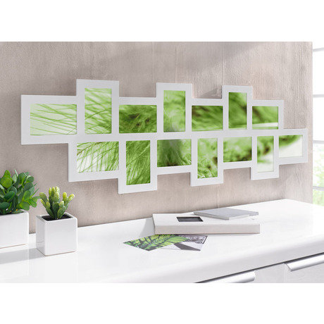 Коллаж изготовлен из дерева, покрытого лаком матового белого цвета, пластиковые прозрачные вставки защитят Ваши фотографии. Размер: 117 х 36см. Подходит для 14 фотографий форматом 14 х 9см. Поставляется без фотографий.
