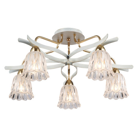 Назначение светильника: для гостиной, Стиль светильника: модерн, Тип: потолочная, Материал светильника: металл, стекло, Диаметр: 620 мм, Высота: 290 мм, Количество ламп: 5 шт, Тип лампы: накаливания, Мощность: 60 Вт, Патрон: Е14, Цвет арматуры: белое золото