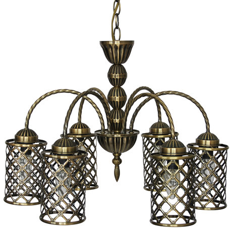 Назначение светильника: для комнаты, Стиль светильника: кантри, Материал светильника: металл, Диаметр: 560 мм, Высота: 394 мм, Количество ламп: 6 шт, Тип лампы: накаливания, Мощность: 40 Вт, Патрон: Е14, Пульт ДУ: нет, Цвет арматуры: латунь