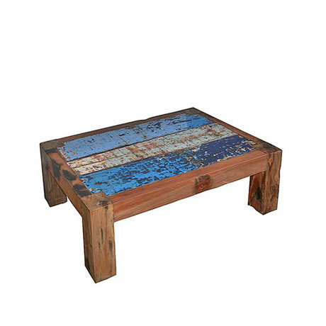 Кофейный стол на массивных ножках выполнен из фрагментов старых рыбацких лодок, сохранен оригинальный окрас, покрыт шеллаком.
