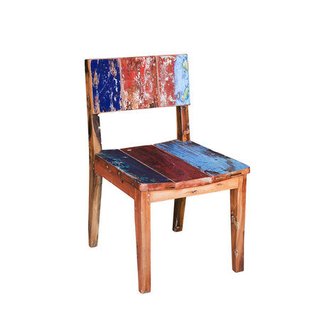 Стул, выполненный из массива древесины старого рыбацкого судна, такой как: тик, махогон, суар, с сохранением оригинальной многослойной окраски. Классический стул походит для использования как в столовой зоне, так и для работы. Подходит для использования как внутри помещения, так и снаружи. Сборка не требуется. Предмет изготовлен из ценных твердых пород древесины (тик, махогон, суар), обладающих высокой износостойкостью, долговечностью и водоотталкивающими свойствами. Древесину с такими свойствами использовали индонезийские рыбаки для создания лодок, а мебель из нее подходит для использования как внутри помещения, так и снаружи. Покрыт натуральным шеллаком.