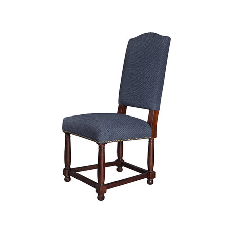 Великолепный стул в яркой синей мягкой обивке, декорированной гвоздиками. Стул опирается на устойчивые деревянные ножки.
